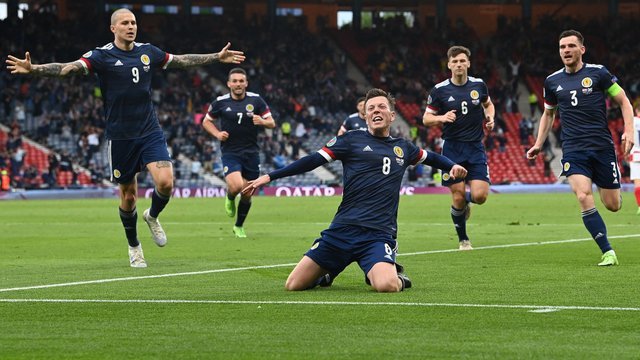 Раптом Шотландія прямо по закінченню першого тайму забиває гол. На останніх хвилинах Каллум Макгрегор потужно пробив у нижній кут воріт.