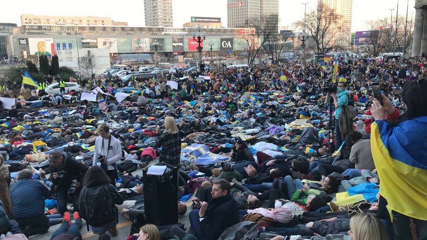 While you are talking we are dying - thousands of Ukrainians in Warsaw lied down today to commemorate victims of war and to call @POTUS to deliver air defence weapon to Ukraine now. Every minute of delay kills. pic.twitter.com/9bUbAL8oPx