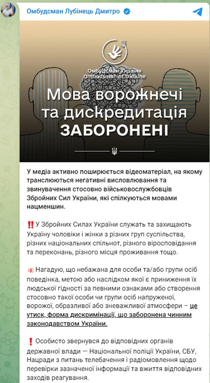 "Нагадую, що небажана для особи та/або групи осіб поведінка, метою або наслідком якої є приниження їхньої людської гідності за певними ознаками або створення стосовно такої особи чи групи осіб напруженої, ворожої, образливої або зневажливої атмосфери — це утиск, форма дискримінації, що заборонена чинним законодавством України", — додав Лубінець.