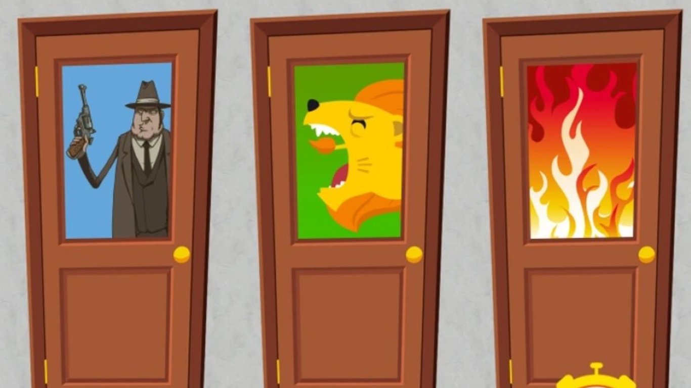 Есть только три двери, через которые можно продолжить путь. За первой дверью скрывается вооруженный убийца; за второй — лев, не евший три года, за третьей — пожар.