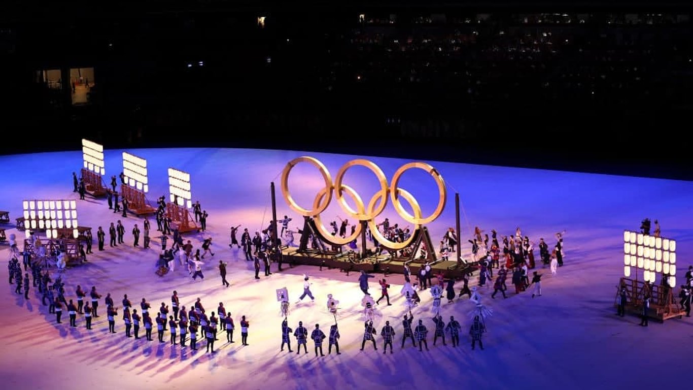 Далее на арену вынесли деревянные олимпийские кольца, которые создали участники церемонии. Все происходило в японском стиле, выступали представители различных видов спорта, в частности, боевых искусств. После этого раздался салют.