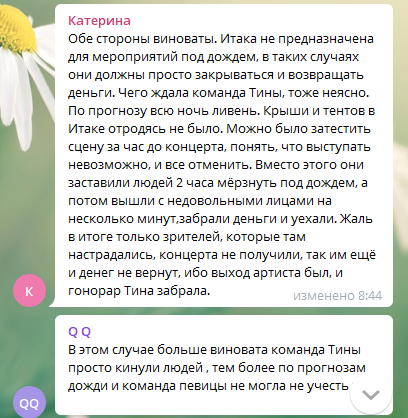 Зазначається, що Тіна Кароль виспупала в нічному клубі "Ітака". Коцерт повинен був розпочатися о 23:00, втім до прихильників зірка вийшла близько опівночі.