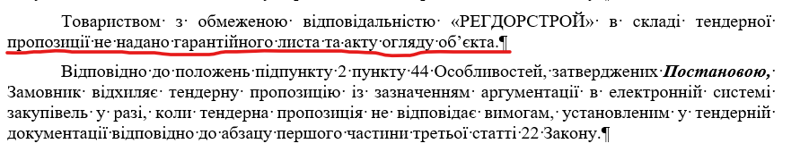 Як наслідок — Замовник відхилив пропозицію компанії "Регдорстрой" саме через те, що вона не надала гарантійного листа та акту огляду об’єкта.