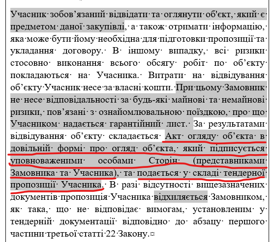 За даними ЗМІ, аби звузити конкуренцію та створити перешкоди іншим учасникам в торгах, Замовник встановив вимогу щодо надання у складі тендерної пропозиції учасника акту огляду об’єкта, який підписується представниками Замовника та Учасника.