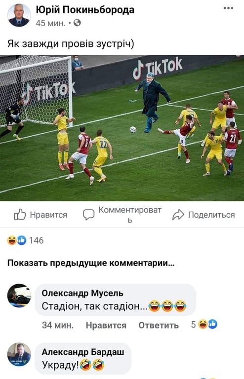 Юрій Покиньборода, український військовик та командир батальйону "Київщина" Головного управління Міністерства внутрішніх справ України глузливо відреагував на присутність колишнього президента Петра Порошенка на полі словами: "Як завжди провів зустріч".
