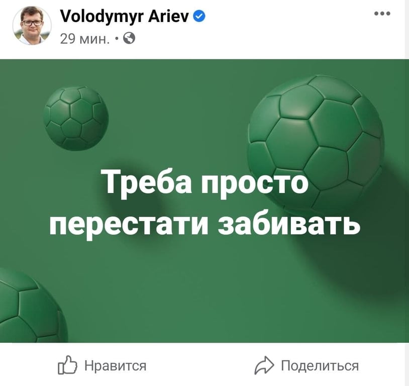 Український політик та журналіст Володимир Ар'єв побажав нашим футболістам "перестати забивать" на голи.