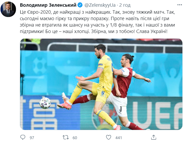 "Це Євро-2020, де найкращі з найкращих. Так, знову тяжкий матч. Так, сьогодні маємо гірку та прикру поразку. Проте навіть після цієї гри збірна не втратила як шансу на участь у 1/8 фіналу, так і нашої з вами підтримки! Бо це – наші хлопці. Збірна, ми з тобою! Слава Україні!"- написав Зеленський.