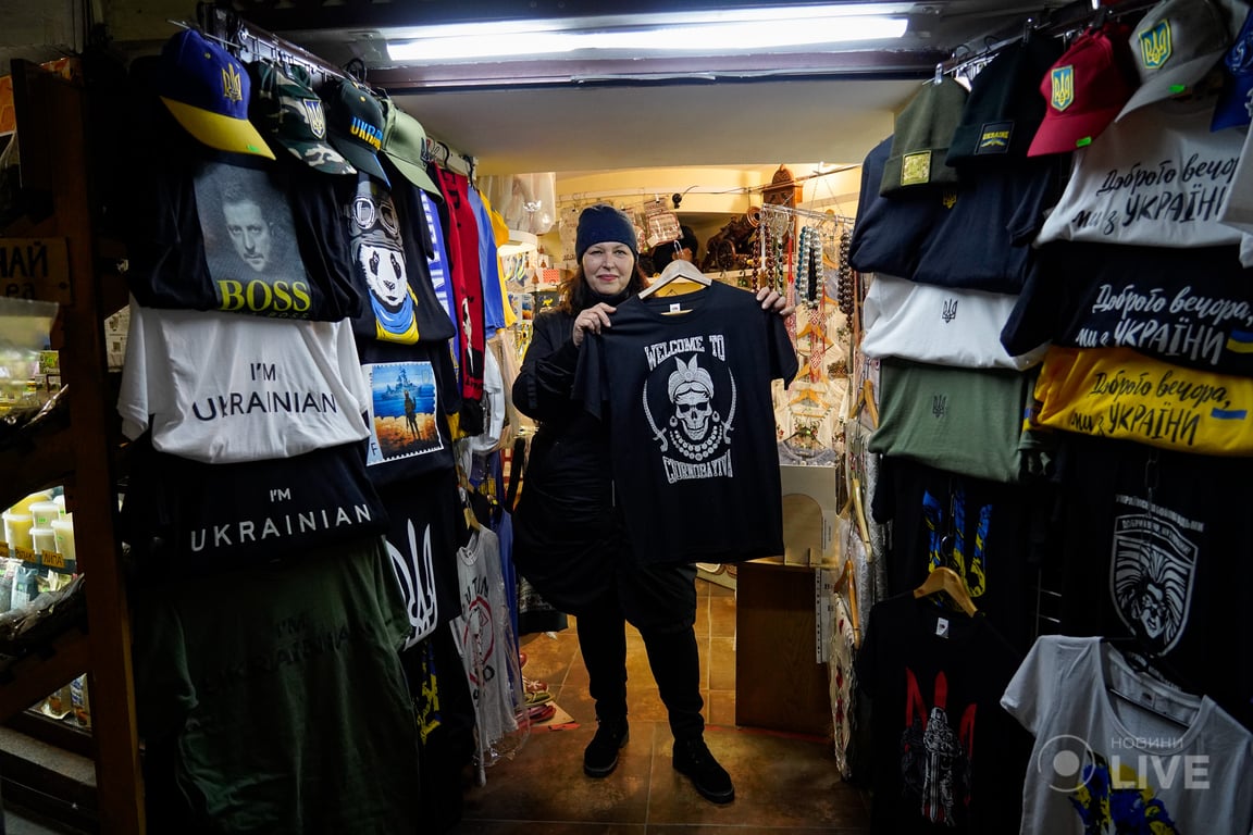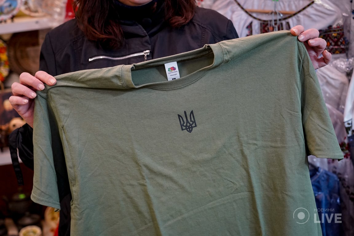"А ще приходять військові і купують шеврони, футболки. Військові часто обирають з написом "4.5.0", — говорить продавчиня.